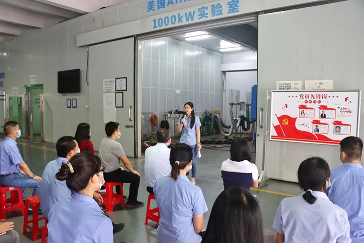 在高美空調設備有限公司的實驗室(shi),工人們(men)排(pai)排坐,認真聆聽微黨課(ke)“充(chong)電”。