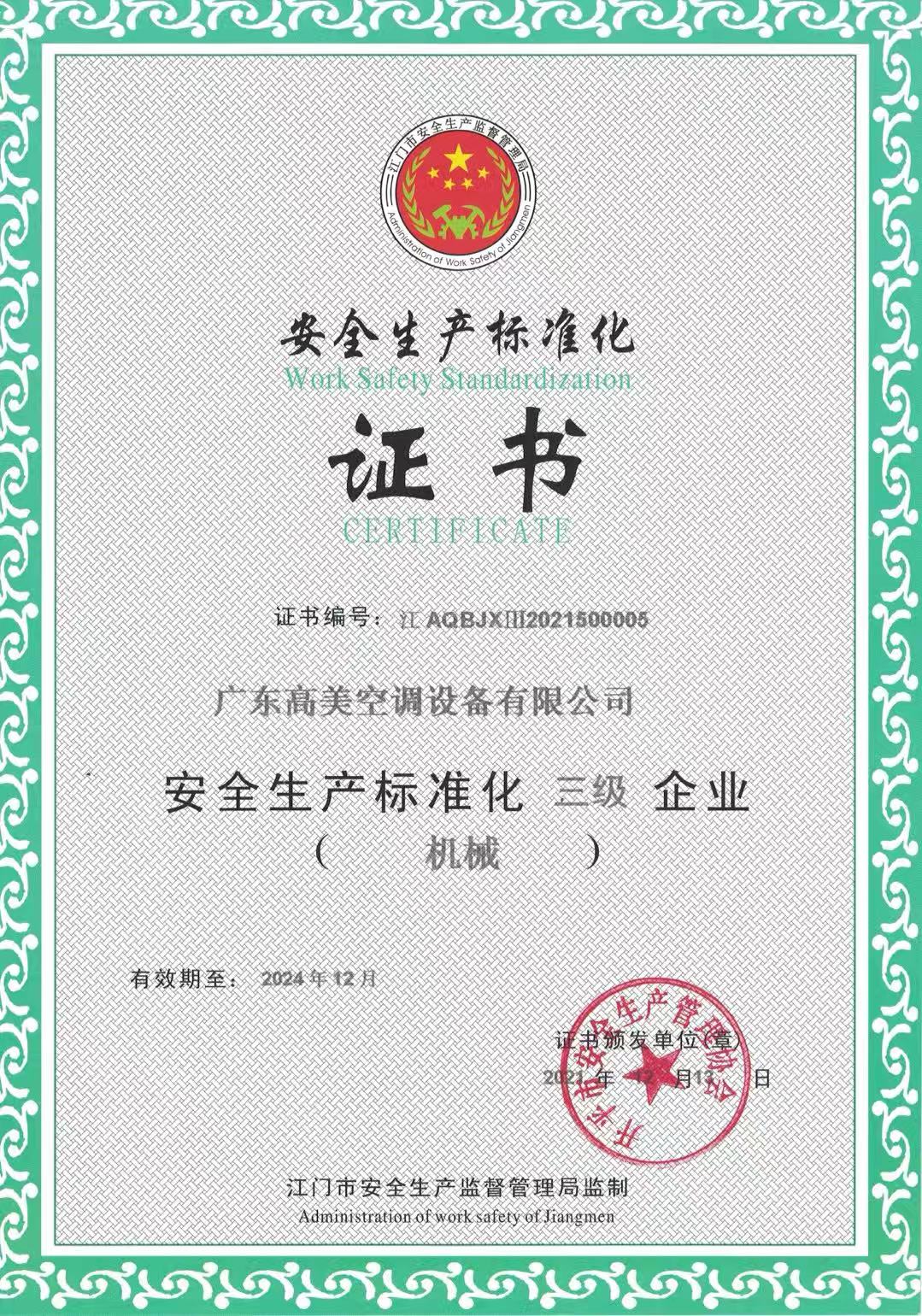 祝賀廣東(dong)高美空調設(she)備有限公司取得安全生産標準化三級認證證書(shu)