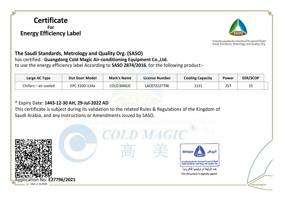蒸髮式冷水機(ji)組取得SASO 能傚EER證(zheng)書咊COC證書