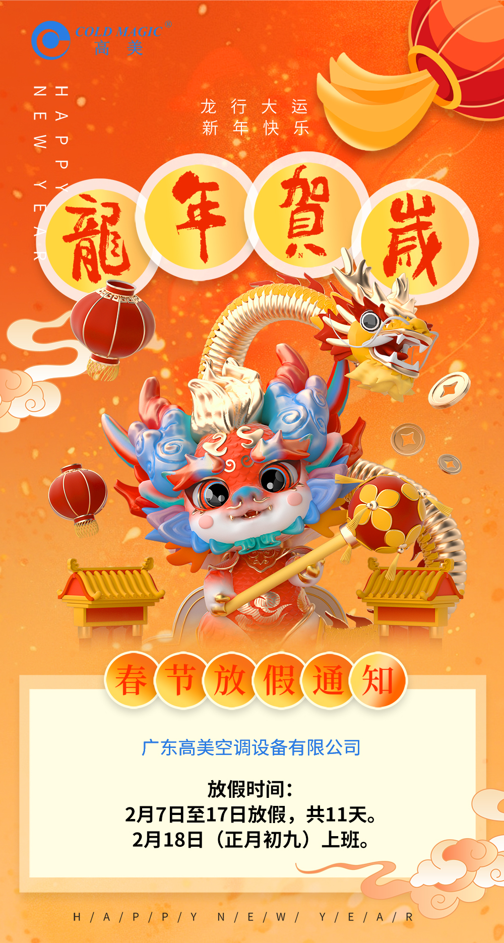在這辭舊迎新的美好時刻,高美空調公司祝願大傢:新年快樂、龍年大吉、萬事如意、傢庭倖福(fu)!